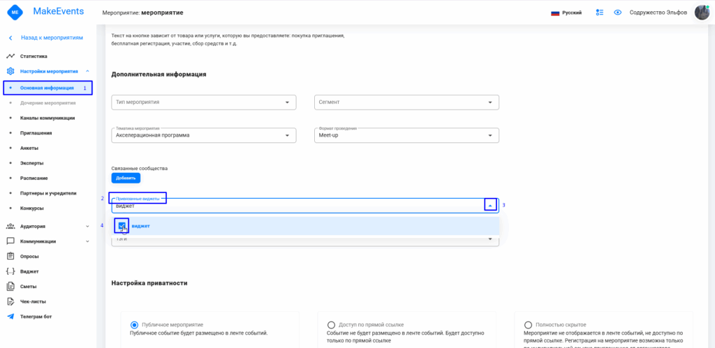 - Создать мероприятие и перейти к настройкам мероприятия в раздел «Основная информация»