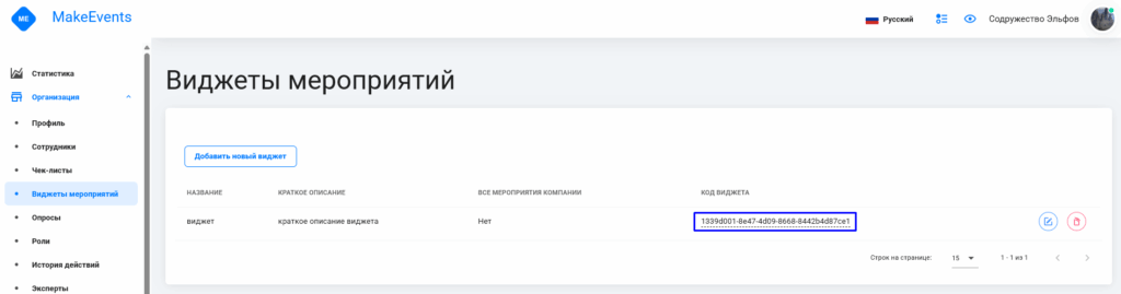 При открытии раздела «Виджеты мероприятий» открывается таблица со списком всех созданных виджетов.